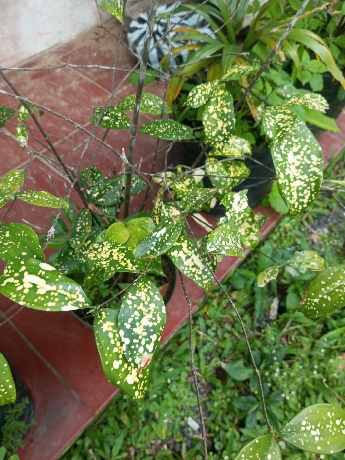 The scene depicts a close-up, high-angle view of a potted plant situated outdoors in Tecuci, Romania. The central subject is a plant featuring green leaves densely speckled with light yellow or cream-colored spots. Several thin, bare brown stems extend from the plant. It is housed in a dark, round pot, partially visible at the base of the plant. To the left and slightly behind the central plant, a reddish-brown tiled surface is visible. To the right and lower portion of the frame, a patch of green ground cover or grass is present. In the upper background, other green plants are visible, some with darker foliage. An object with a black and white striped pattern is discernible in the upper center-right background, partially obscured by foliage. No individuals, specific actions, or interactions are present in the image.