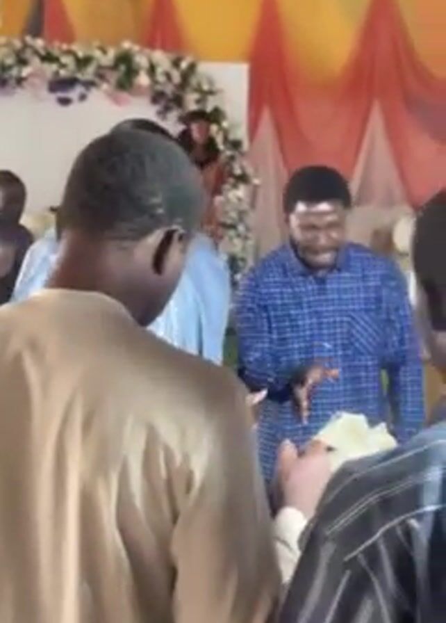 group of men standing around a person sitting on a chair. The seated person is wearing a white head covering. The men are dressed in a variety of clothing, including traditional African attire and Western-style shirts. The man in the blue patterned shirt is gesturing with his hands while talking. The environment appears to be indoors, with a backdrop of colorful drapery and floral arrangements.