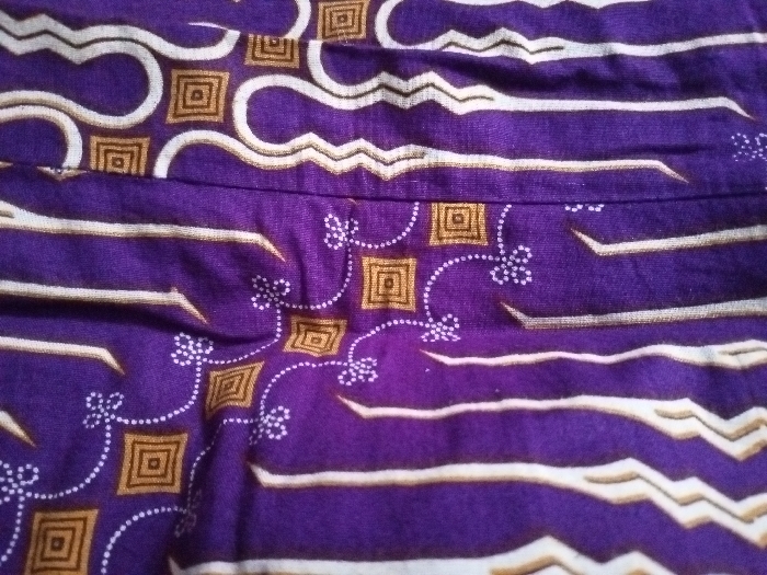 The scene is located in the city of Batheay, Cambodia. The image presents a close-up, top-down view of a purple textile material. The fabric is patterned with horizontal, undulating stripes in white, outlined with a light brown or gold color. Interspersed across the purple background are square motifs, each containing a smaller concentric square, rendered in a similar light brown or gold. White dotted lines, forming small clusters or decorative shapes resembling bows, connect some of these square elements. A horizontal seam or fold line is visible across the middle of the fabric. The textile exhibits minor creasing. No individuals, actions, or environmental context beyond the fabric itself are present in the image.