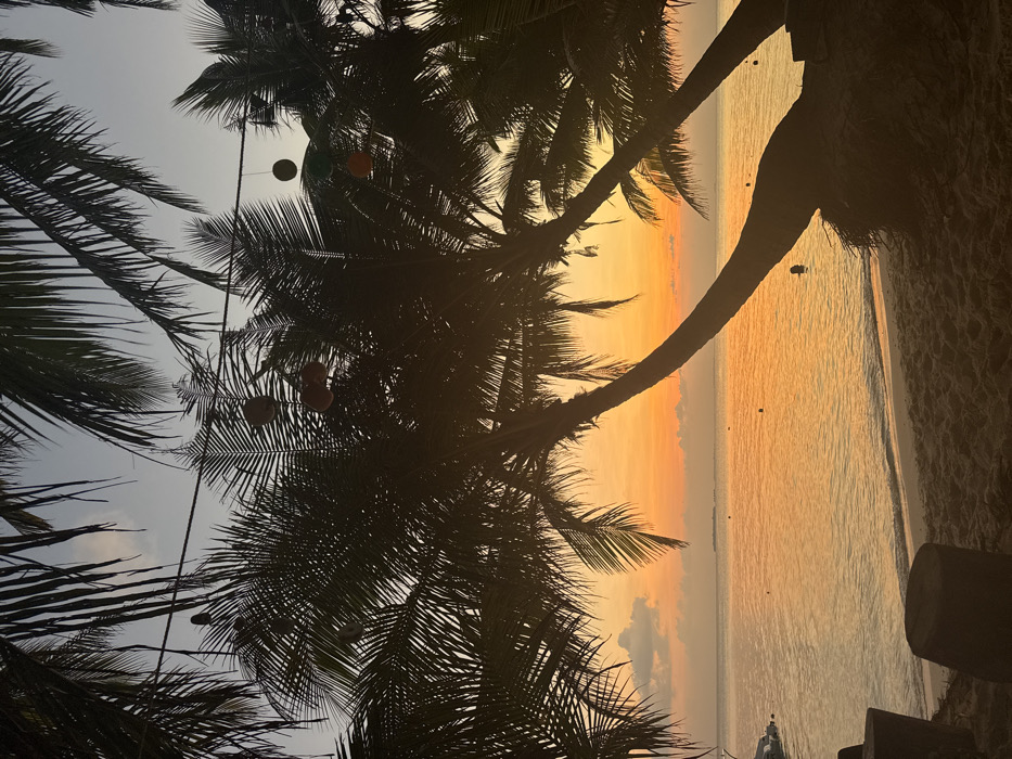 This image depicts a tropical beach scene during sunset on Ukulhas, Maldives