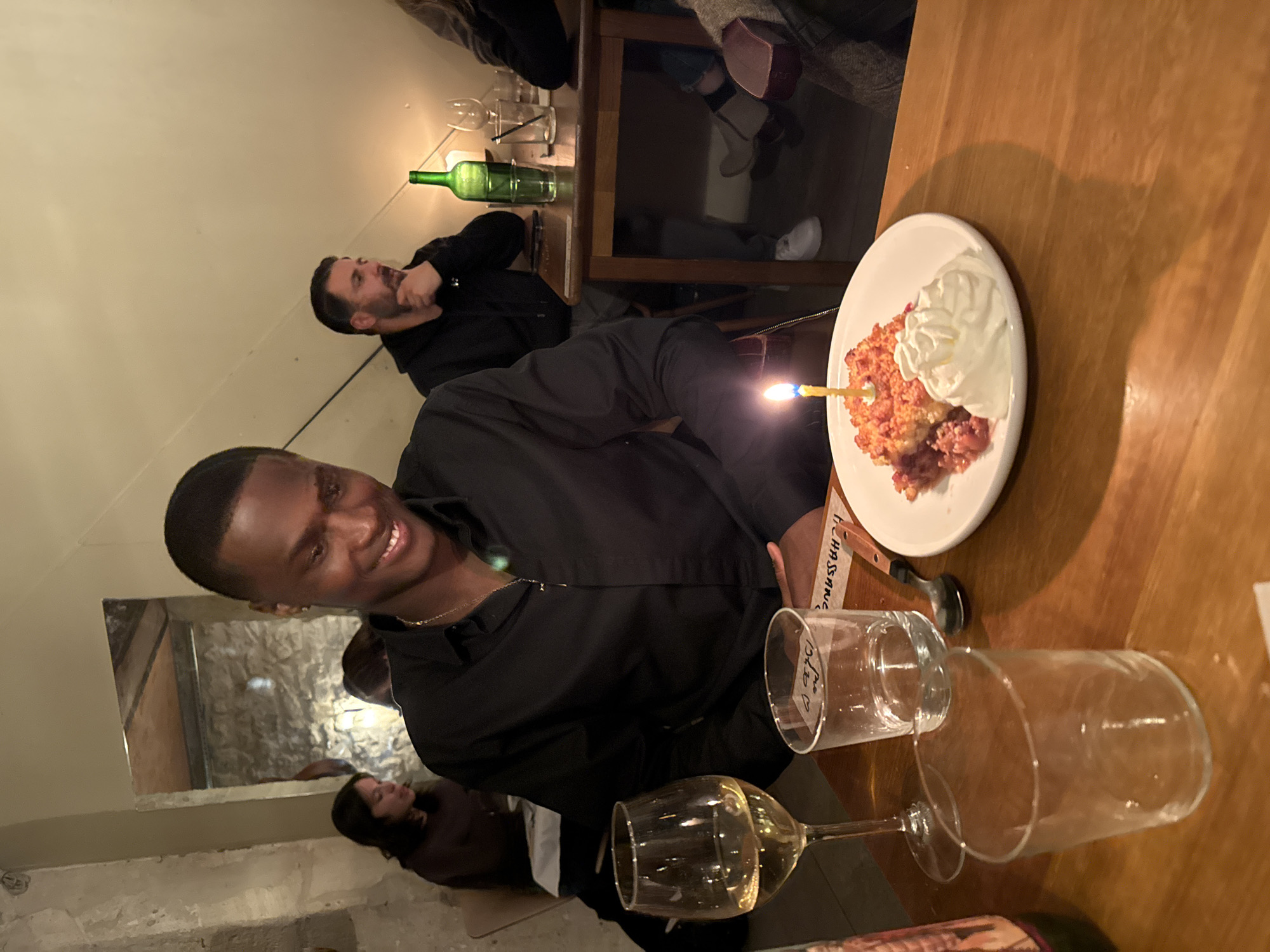 The image depicts an indoor scene within a dimly lit restaurant or bar, located in Paris, France. In the foreground, a young Black male with short dark hair, wearing a black collared shirt and a gold chain with a cross pendant, is seated at a wooden table. He is smiling and looking down at a white plate containing a dessert, possibly a fruit crumble, topped with whipped cream and featuring a single lit birthday candle. To his left, a stemmed wine glass holds a quantity of white wine. Two empty clear glasses are also on the table near a silver spoon. Partially visible on the table is a piece of paper with handwritten text, including "CHASSAGNE." In the background to the left, a woman with dark hair is seated at another table. To the right, a man with a dark beard, wearing a dark hoodie, is seated at a separate wooden table, resting his chin on his hand. On his table, a green bottle, several glasses, and a small lit candle are visible. Beneath this table, the lower legs and feet of another individual, wearing light-colored boots, are visible. The walls of the establishment exhibit a textured, light-colored stone finish on the left and a plain, light-colored surface elsewhere.