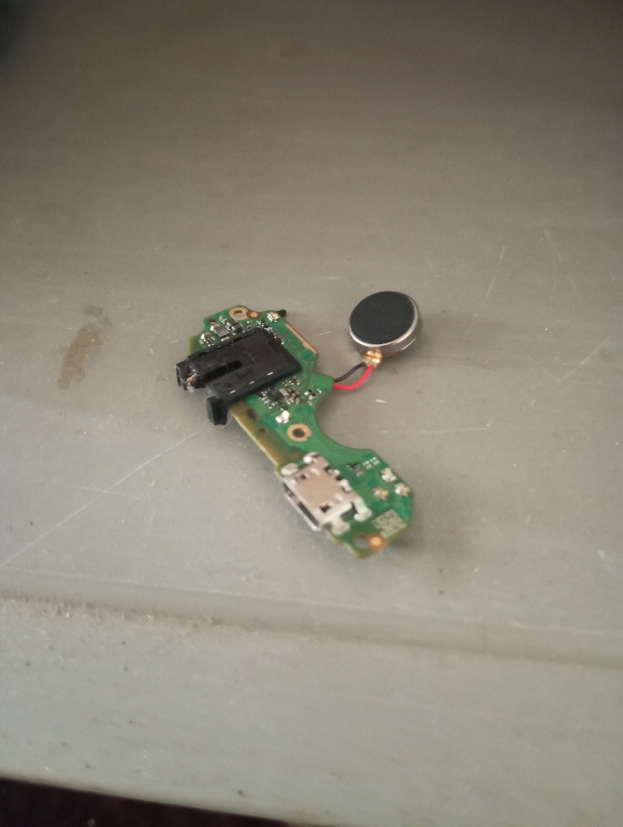 A small, irregularly shaped green printed circuit board (PCB), approximately 5-7 cm in length, rests on a light grey, slightly textured surface. The PCB features a black 3.5mm audio jack connector at one end and a metallic micro-USB charging port at the other. A circular, silver vibrator motor with a black eccentric weight is connected to the PCB via red and black wires. Numerous surface-mount device (SMD) components, including integrated circuits, resistors, and capacitors, are populated across the PCB's surface. The background surface displays minor scratches and a faint, elongated smudge. The lighting is even, indicating an indoor setting. The image provides no visual information to determine its location within the city of Wrocław, Poland, or any other specific geographic area. No people are present, and no actions or interactions are depicted.
