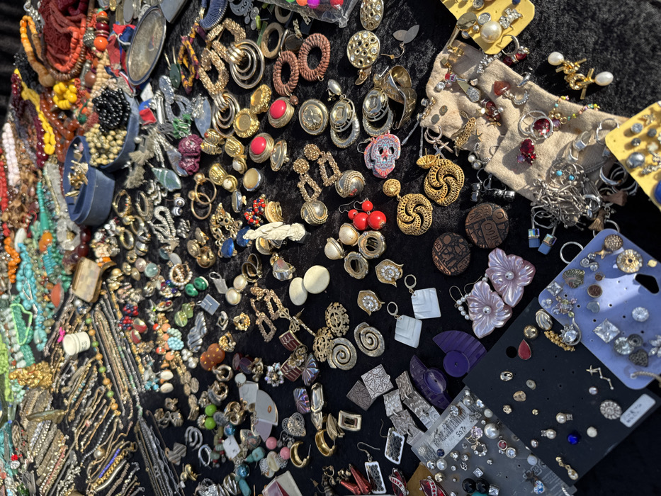 The image provides a high-angle, detailed view of a market stall displaying an extensive collection of costume jewelry and accessories on a dark, likely black, fabric surface