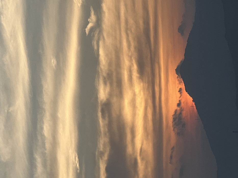 This image depicts a mountainous landscape at either sunrise or sunset in Cam Đức, Vietnam. The lower third of the frame is dominated by a dark grey-black mountain range, presented in silhouette. The sun, appearing as a bright orange and red glow, is partially obscured by the crest of the main mountain peak. Above the mountains, the sky is filled with extensive, layered horizontal cloud formations. These clouds exhibit a color gradient, transitioning from pale yellow and light grey tones in the upper sky to vibrant orange and reddish hues closer to the horizon. Faint, dark vertical structures, consistent with power line towers, are discernible on the left slope of the primary mountain, silhouetted against the bright sky behind the peak. No individuals, animals, or specific actions are depicted within the scene.