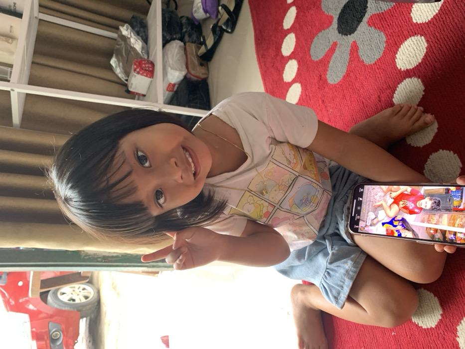 A young girl with dark hair and a white T-shirt smiles and makes a peace sign. She sits cross-legged on a red rug with a gray flower pattern. She's holding a phone displaying a video of a person in a red shirt near grocery shelves. Part of a red car and a white shelf with various items are visible in the background. The photo is taken at a tilted angle.