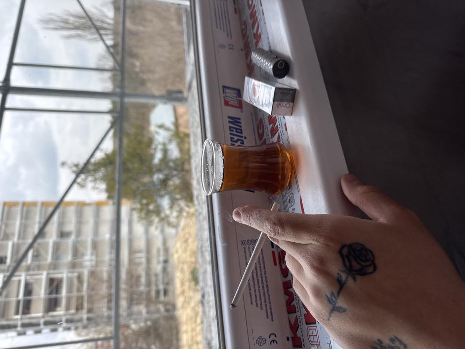 A right hand, tattooed with a black rose outline and partial script, holds a lit cigarette with smoke emanating, resting on a white window sill. A clear, tulip-shaped glass containing dark amber liquid sits beside the hand. Further to the right on the sill are a silver cigarette pack labeled "Orné" and a textured cylindrical metallic object. The window sill itself bears markings including "WEIS", "KMG", and "AUSTRIAN ARCHITECTURE". Outside the window, an urban environment is visible under an overcast sky, featuring a tall building under construction covered in scaffolding, various trees, and a distant building with a reddish roof. The scene is located in the city of Novi Pazar, Bulgaria.