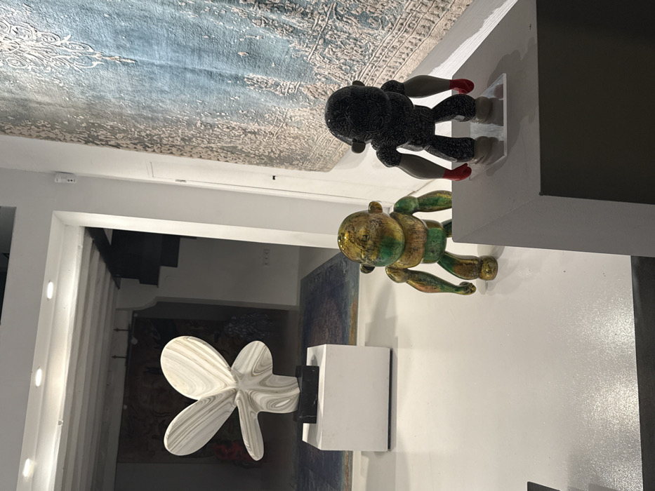 This image captures an interior scene, likely an art gallery or showroom, situated in Palma de Mallorca, Spain. The space features clean white walls and a reflective white floor, illuminated by recessed spotlights in the ceiling. In the right foreground, a black, stylized anthropomorphic sculpture with intricate white patterns, light grey forearms, and red hands stands on a clear acrylic base atop a dark grey pedestal, facing away from the viewer. To its left, another similar sculpture, predominantly gold and green with a mottled finish, stands directly on the white floor, also facing away. On the left side of the mid-ground, a large, abstract sculpture with a multi-lobed, organic shape, characterized by white and grey swirling patterns, rests on a black square base atop a white cubic pedestal. Along the right wall, a large, ornate textile or rug is displayed vertically. It features a light blue background with intricate, lighter-toned, possibly floral or arabesque patterns, exhibiting a somewhat distressed appearance. In the background on the left, an adjoining room or area is visible, featuring exposed wooden ceiling beams and a dark staircase ascending. Another large artwork or textile is partially visible on the far back wall. Two electrical outlets are present on the lower left wall in this background section. No individuals are present in the scene.