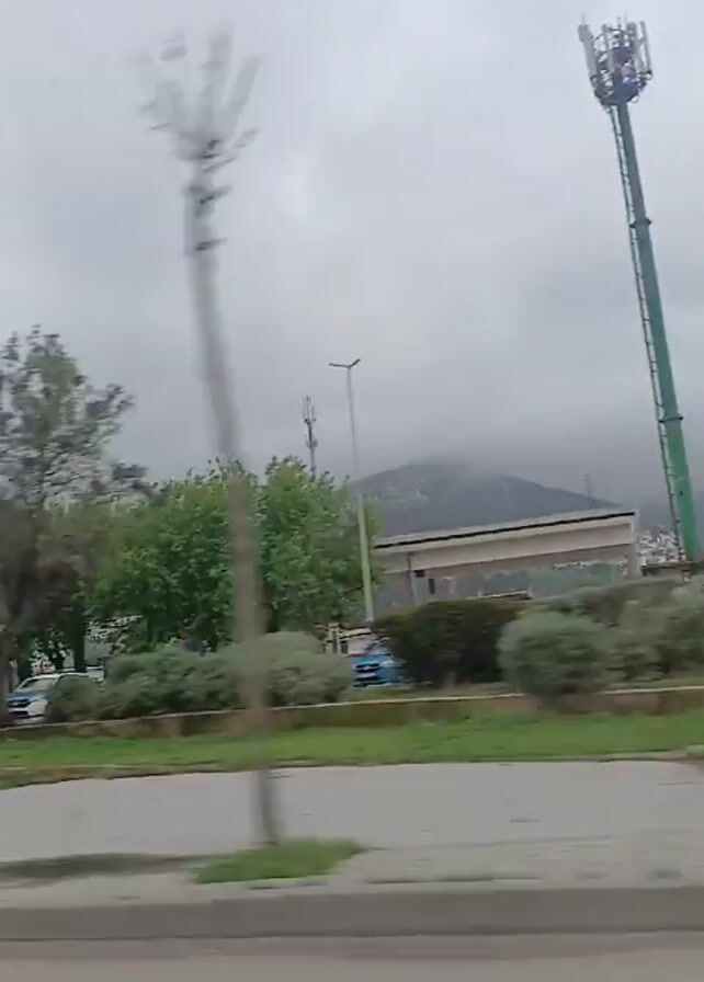 drive-by view of a cityscape on a cloudy day. The camera captures a street with a sidewalk featuring manicured lawns and topiaries shaped like globes. A series of these trees line the road, interspersed with regular trees and traditional street lamps. Cars can be seen driving on the road. In the background, buildings with white facades and green accents are visible, along with distant hills shrouded in mist. A cell tower is visible in the background, positioned behind one of the globe-shaped trees.