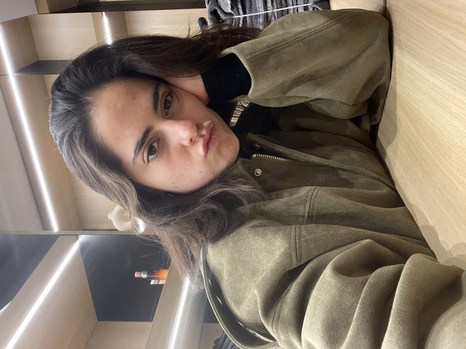 A brunette woman with fair skin gazes at the viewer with a pouting expression. She wears an olive-green suede jacket over a black top. Her hair is shoulder-length and casually styled. Her left hand rests on her cheek. The background features a lit shelf with bottles, suggesting a retail setting. The image is taken at an angle, with the woman positioned on the left side of the frame.