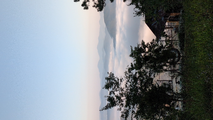 The image displays a panoramic landscape in Phát Chi, Vietnam, captured from an elevated viewpoint. The upper two-thirds of the frame consists of a clear sky, transitioning from a light blue overhead to a faint pale orange-pink gradient near the horizon, indicative of dawn or dusk. Fine speckling is visible across the sky. Below the clear sky, a dense layer of white fog or low-lying clouds fills the valleys, partially obscuring a series of rolling mountain ranges that recede into the distance. The mountains are dark green from vegetation where visible above the fog. In the immediate foreground, the lower quarter of the frame features dark green grass and the foliage of several trees, partially obscuring the midground. Behind these trees, towards the right, a structure with a dark, sloped roof and visible wall sections is present. To the left of this, also partially obscured by trees, an outdoor area with a white railing or fence is visible, containing what appears to be a table, chairs, and a large, dark spherical object. No individuals are present, and no specific actions or interactions are depicted.
