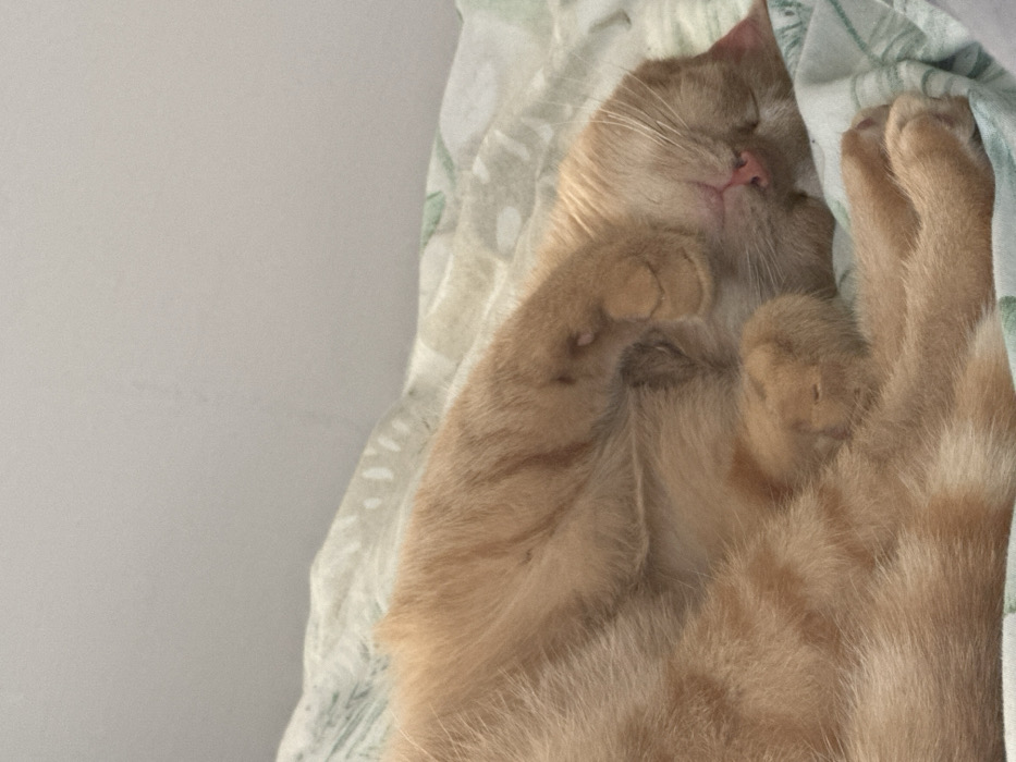 - "An adult domestic cat, exhibiting an orange tabby coat with darker stripe patterns, is observed in a state of rest, curled on its left side with eyes closed, indicative of sleep" by FM-TLGG62, licensed under CC BY 4.0