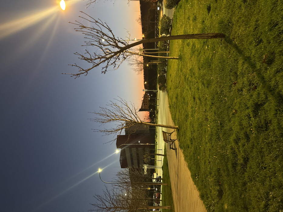 The image depicts an urban landscape in Getafe, Spain, at dusk or early night, characterized by a transition from deep blue sky overhead to orange and pink at the horizon. The scene is illuminated by artificial streetlights, one prominent on the left and another on the far right, both casting bright white-yellow light and visible lens flares. In the foreground, a patch of green grass occupies the lower center and right. A light-colored paved pathway borders the grass on the left, curving into the midground. A single, unoccupied dark brown wooden park bench with a slatted back and seat is positioned on the grass next to the pathway, facing towards the right. Several bare deciduous trees with thin branches are scattered across the foreground and midground, some casting shadows on the grass. The midground features a wide, dark asphalt road or intersection running horizontally across the frame. Multiple parked cars are visible on the left side of this road, behind a row of trees. A faint, blurry streak on the far right of the road suggests the presence of a moving vehicle. In the background, behind the road, a multi-story building with light-colored lower sections and dark red upper structures stands prominently on the left. A red sign displaying "UC3M" is partially visible in the distance, positioned near the horizon. A continuous dark wall or fence runs horizontally across the mid-to-background, separating the road from further elements and additional distant buildings silhouetted against the colorful sky. Bushes are also visible bordering sections of the roadway. No individuals are present in the scene.