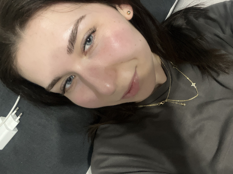 A close-up, angled portrait features a young adult female with fair skin, dark brown hair, and light blue eyes