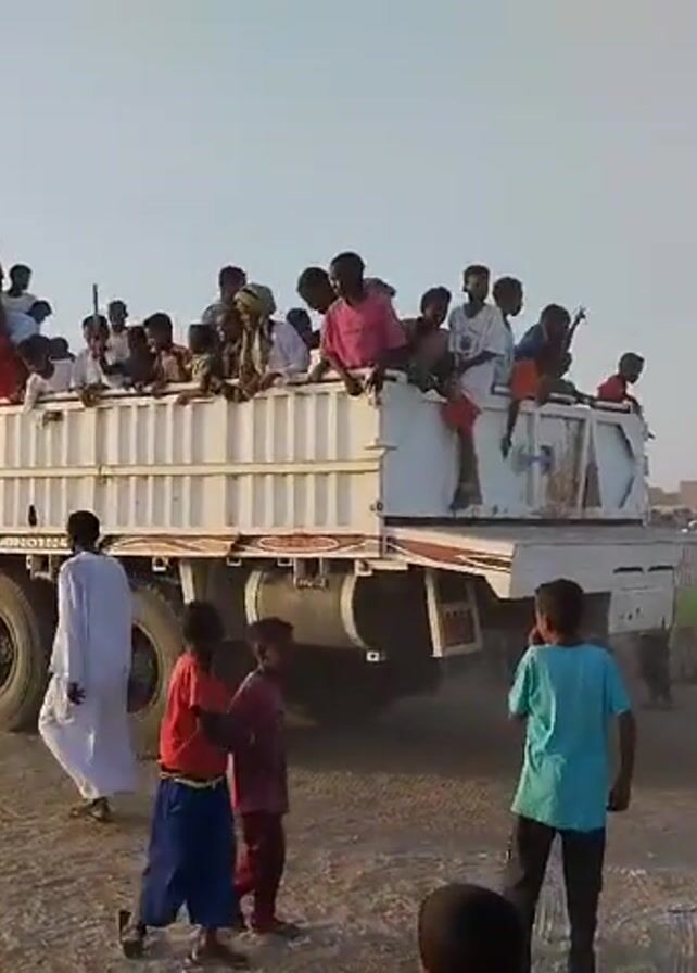 Here's a description of the scene in the video: The video shows a large group of people gathered in a dusty, open area. The focus is on a white flatbed truck that is filled with people, mostly children. Some are climbing onto the truck, while others are sitting on top or hanging onto the sides. A crowd of people, including many children, is gathered around the truck, watching or interacting with those on the truck. The people are wearing a variety of casual clothing. The sky is bright and clear, suggesting it is daytime. In the background, there are some buildings and tents, suggesting a populated area. The sound of music can be heard.