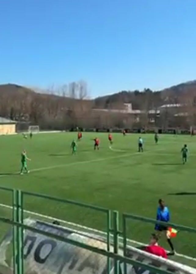 soccer match being played on a sunny day. Players in green and red jerseys are spread across a green field. A referee and assistant referee are present. Buildings and trees are visible in the background. The video is taken from behind a barrier.