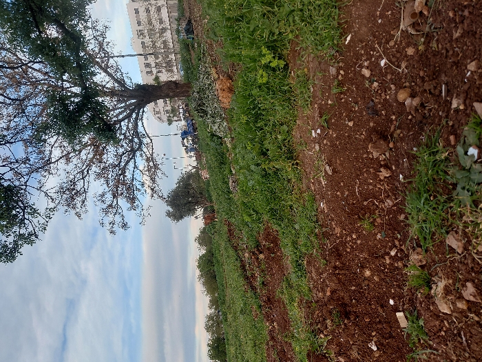 This image depicts an outdoor scene in Fez, Morocco, showcasing a transitional area between cultivated land and an urban periphery under a partly cloudy sky. In the foreground and mid-ground, the terrain consists of reddish-brown soil, partially tilled into distinct furrows on the left, interspersed with patches of green herbaceous vegetation and scattered small rocks. Some minor white debris is visible on the ground. The land slopes upwards from left to right towards the background. A large, mature deciduous tree with a thick, gnarled trunk and a canopy of both green and browning leaves dominates the right side of the mid-ground. Beneath this tree, a substantial pile of freshly cut green branches and foliage is accumulated. To the left of the tree, two individuals, appearing male, are visible in the distance, one wearing a blue garment. They are positioned near the debris pile and a blue object resembling a utility cart or bin. A tall, thin pole with white and black horizontal stripes stands vertically behind the tree. In the background on the right, a large, multi-story white building with a uniform facade and numerous windows indicates a modern urban or institutional structure. A line of smaller trees and bushes marks the distant horizon on the left.