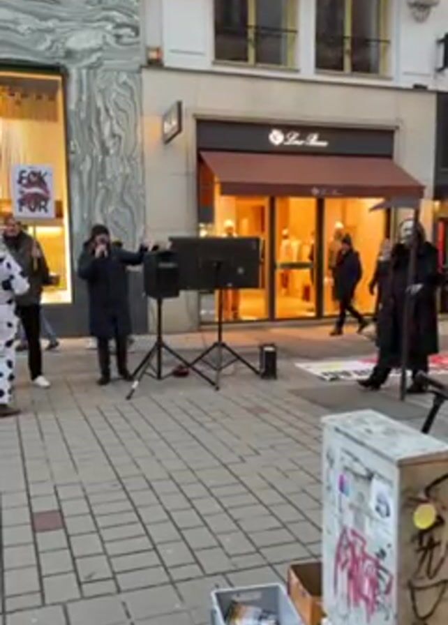 demonstration in front of a store called Loro Piana. A man speaks into a microphone that is connected to a sound system. To the left of the speaker, someone is dressed in a cow costume, and someone else holds a sign that says “FCK FUR.” To the right of the speaker, someone is dressed as the Grim Reaper. People walk by the demonstration on the sidewalk.