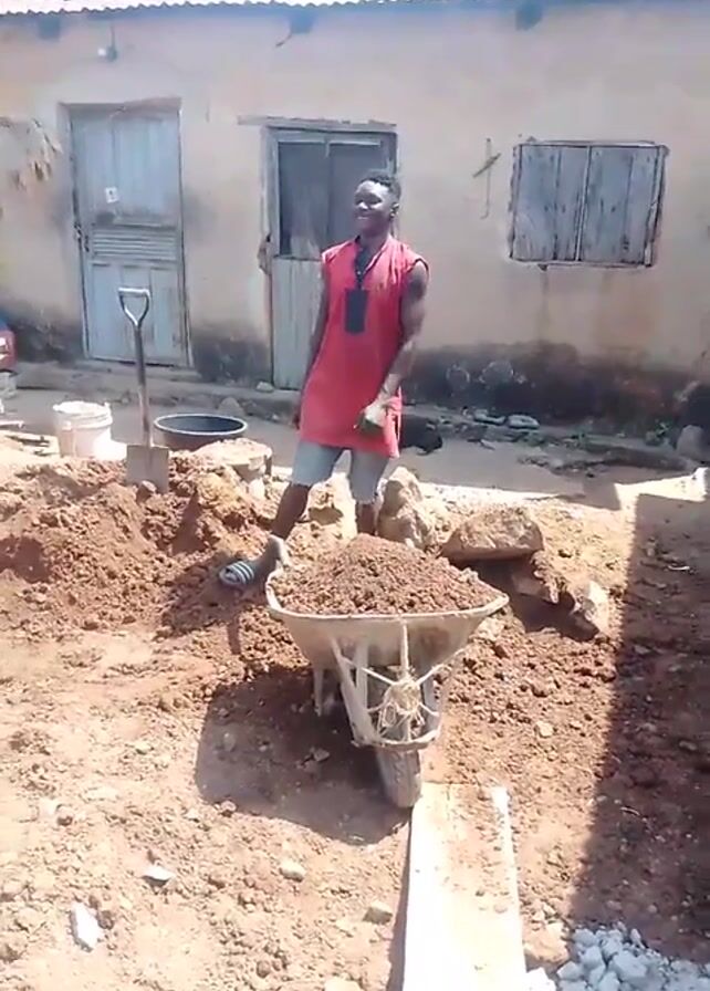 A man in a red sleeveless shirt and gray shorts stands in front of a wheelbarrow full of dirt, next to a pile of dirt and stones. Behind him is a building with a blue door and two windows with closed shutters. To the left of the man are construction tools, including a shovel and a bucket. In the background to the right, another man sits on the ground near a separate building. The ground is covered in dirt.