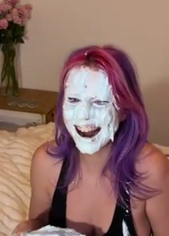A woman with pink and purple hair has a blue-tinted white pie filling smeared all over her face and chest. She is sitting in what appears to be a bedroom with a white comforter behind her and a small end table on her left. A vase with pink roses sits on the table. The woman is holding the plate with the rest of the pie filling in her hands. She is laughing, and then opens her mouth in an exaggerated expression.