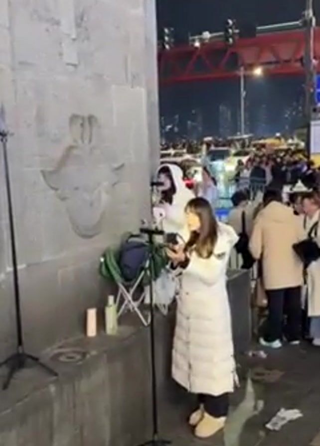 two women on a busy street corner at night, possibly livestreaming. The woman in the foreground, wearing a white coat, is holding and looking at her phone while talking. Behind her and to the left, the other woman, wearing a white hooded sweatshirt, is also holding and looking at her phone, which is attached to a tripod. Both women have multiple phones set up on tripods. A green folding chair is visible between them. A crowd of people can be seen walking on the sidewalk and street behind them. The street is wet, and there are city lights and building in the background.