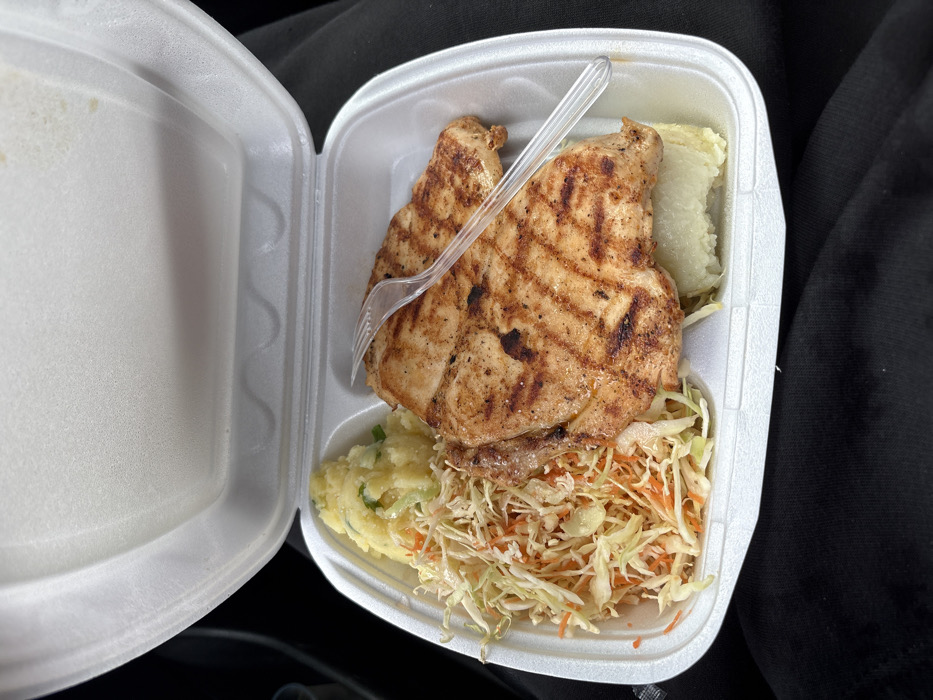 A white, multi-compartment styrofoam takeout container, open, is positioned on a dark-clothed surface, consistent with a person's lap, in an indoor environment within Dibich, Bulgaria. The container holds a prepared meal. The left compartment contains shredded cabbage and carrot slaw. The upper-left compartment contains a portion of mashed potatoes, interspersed with green fragments. The largest, right compartment holds two grilled chicken breasts, displaying distinct char marks. A clear, disposable plastic fork rests diagonally across the upper chicken breast. A smaller portion of a pale, mashed side dish is visible beneath the rightmost chicken breast. No individuals are fully visible; only a partial view of dark clothing is present in the lower frame.