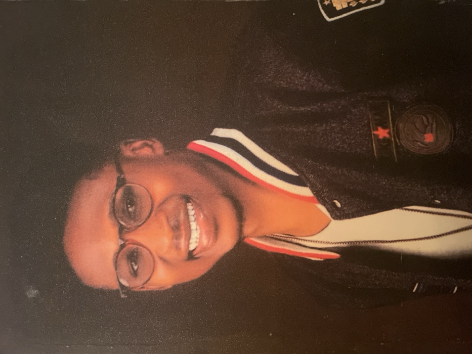 A young adult male, of dark complexion and short, dark hair, is depicted in a chest-up portrait against a plain, dark background. He wears dark-framed glasses and smiles directly at the camera, revealing his upper teeth. His attire consists of a dark-colored jacket with a collar featuring red, white, and blue stripes. Underneath, a white t-shirt is visible, from which a thin, dark chain necklace hangs. The jacket's left side (viewer's right) displays two distinct patches: a red star centered on a dark rectangular patch, positioned above a circular patch with a red element integrated into an intricate design. A partially visible, rectangular patch with white and gold elements is present on the jacket's right side (viewer's left). The specific location within the city of Bauchi, Nigeria, cannot be determined from the visual information provided.