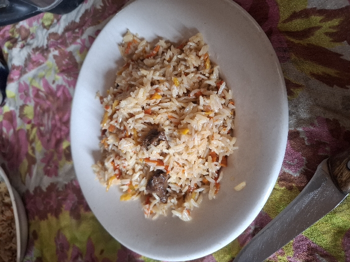 - "A white ceramic plate centrally displays a serving of Uzbek Plov, a rice dish, on a multi-colored floral tablecloth" by FM-h5fL72, licensed under CC BY 4.0