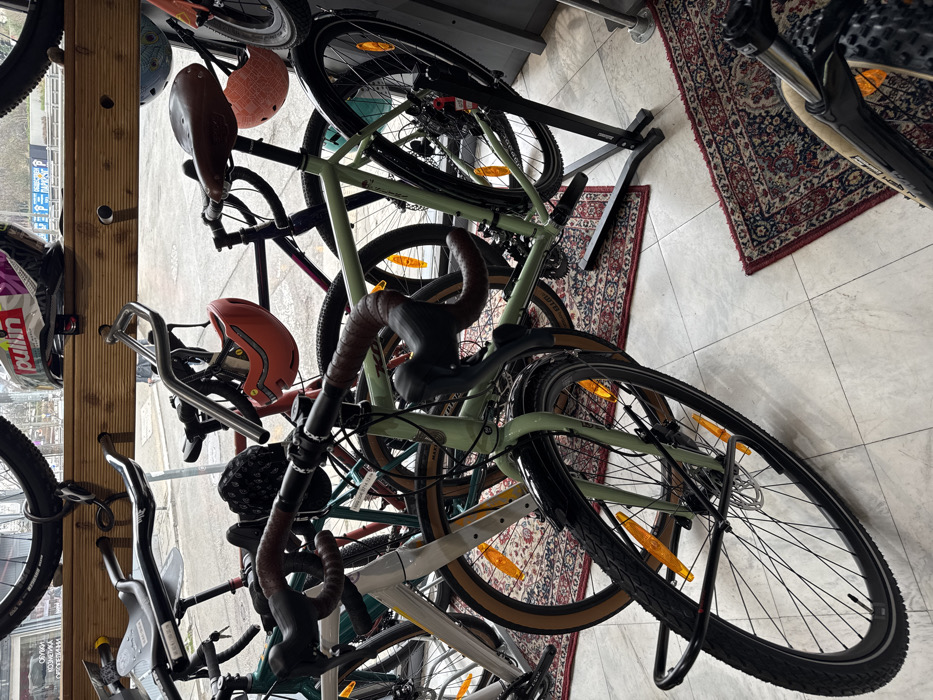 The image depicts the interior of a bicycle retail store, observed looking outwards through a large plate glass window towards a street in an unknown city. The scene is static, featuring multiple bicycles and related accessories on display. In the foreground and midground, numerous bicycles are arranged on the tiled floor and on stands. A light green (mint green) gravel bike with dark brown drop handlebar tape, disk brakes, and black fenders is prominent in the foreground, supported by a black front-wheel stand. Its wheels feature multiple orange spoke reflectors. Behind it, other bicycles are visible, including a white/light grey model with light brown tire sidewalls, a dark green/teal bike, and a dark-colored road bike with a brown leather saddle. Above the main display area, a horizontal wooden beam with circular cutouts spans the width of the window. Various bicycle parts and accessories hang from this beam, including wheels, handlebars, and several helmets. A prominent orange/red bicycle helmet hangs centrally, and a multi-colored helmet with "pullin" branding is visible on the beam. A coiled black cable lock is wrapped around a hanging bicycle wheel. The shop floor consists of light-colored, possibly marble or ceramic, tiles. Three small, rectangular Persian-style rugs with intricate red, blue, and cream patterns are placed intermittently on the tiled floor beneath the bicycle displays. Through the window, an urban street scene is visible under overcast daylight. A paved road surface, distant buildings or structures, and blurry signage (some appearing blue and white) are discernible. No individuals or active vehicles are present in the observable street view.