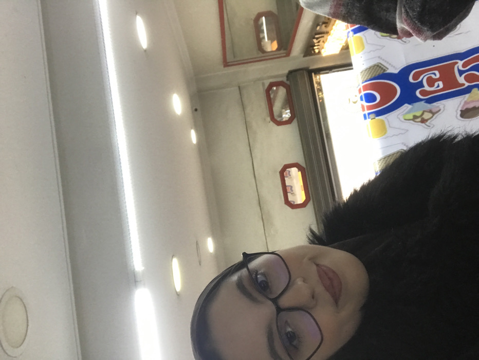 The image captures an indoor scene within a commercial establishment in Meknes, Morocco. A female subject occupies the left side of the frame, facing slightly towards the viewer in a selfie-style composition. She wears dark-rimmed eyeglasses, a dark head covering (hijab), and a black, possibly fur, coat. Her lips show a subtle upward curve. To her right, a second individual's torso and arm are partially visible, wearing a plaid or checkered garment in red and dark tones. The background features a white ceiling illuminated by multiple recessed circular lights and a long, linear fluorescent fixture. The walls are a light, uniform color. Mounted on the wall are at least two small, octagonal mirrors framed in red. Below these mirrors, a metal roller shutter is partially raised, revealing an opening that looks onto a brighter area, potentially an exterior street or another part of a shop. Through this opening, part of an Arabic sign, including "الكبير" (Al-Kabeer, meaning "The Big One" or "The Great One"), is discernible. A large, colorful sign or package, displaying a blue design with the letters "DEC" and illustrations of ice cream cones, is prominently featured in the lower right quadrant of the image, extending from the second individual.