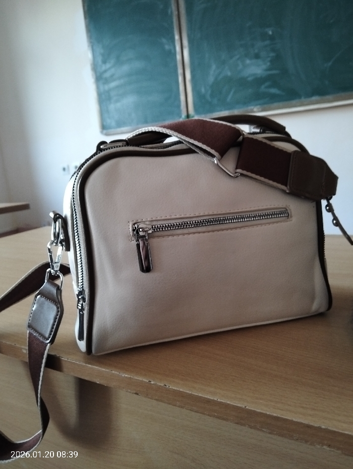 A close-up depicts a beige purse with brown straps, positioned on a wooden table. The purse features a zippered compartment on its visible side and has a distinct boxy shape. In the blurred background, two green chalkboards are visible, suggesting an educational environment like a classroom. The image's timestamp, "2026.01.20 08:39," is printed at the bottom left corner.