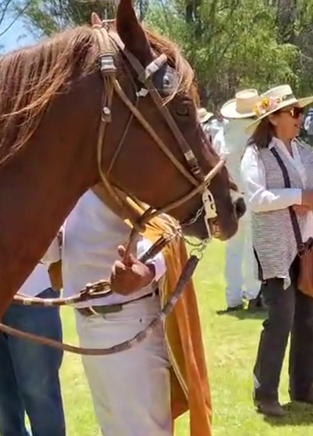 light brown horse being held by a man in white clothes. The horse has a bridle on and a gold-colored cloth is draped over the man's arm. Several people are standing in the background, some wearing hats. The scene appears to be taking place outdoors on a grassy area, possibly a park or event space. The person holding the horse is holding a can in the same hand as the lead rope.