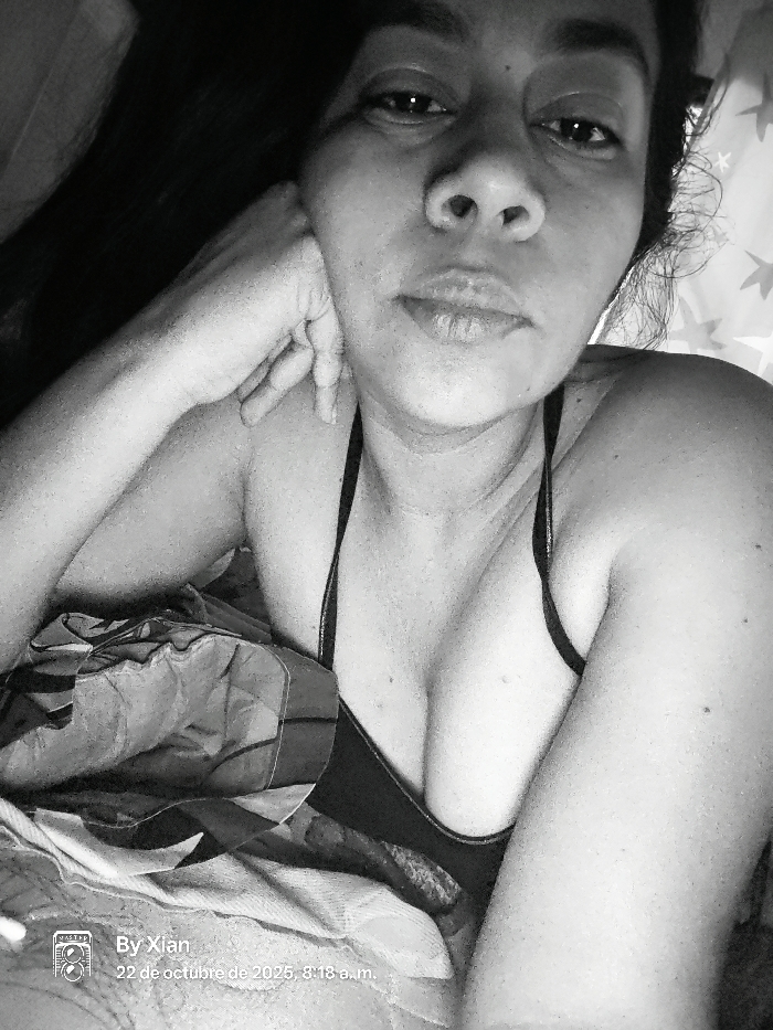 The image is a monochromatic, close-up indoor portrait of a single adult female. The subject is depicted in a prone or reclining position, likely in a bed, looking directly into the camera with a neutral expression. Her left arm is bent, with her hand supporting her jawline. She has dark hair, dark eyes, a prominent nose, and full lips. She is wearing a dark-colored, thin-strapped garment with a low neckline, exposing her upper chest and cleavage. The immediate background on the left is dark and indistinct, while the upper right background shows a lighter-toned fabric with a repetitive star pattern. Below the subject, crumpled textiles, possibly bedsheets or blankets with a subtle geometric pattern, are visible. A digital watermark in the lower left corner displays a camera icon, the text "By Xian," and a timestamp: "22 de octubre de 2025, 3:18 a.m." This indicates the photograph was taken on October 22, 2025, at 3:18 AM. The text is in Spanish, suggesting a Spanish-speaking locale. However, the image itself contains no visual elements (such as landmarks, street signs, or unique architectural features) that specifically identify the location as the city of Cali, Colombia.