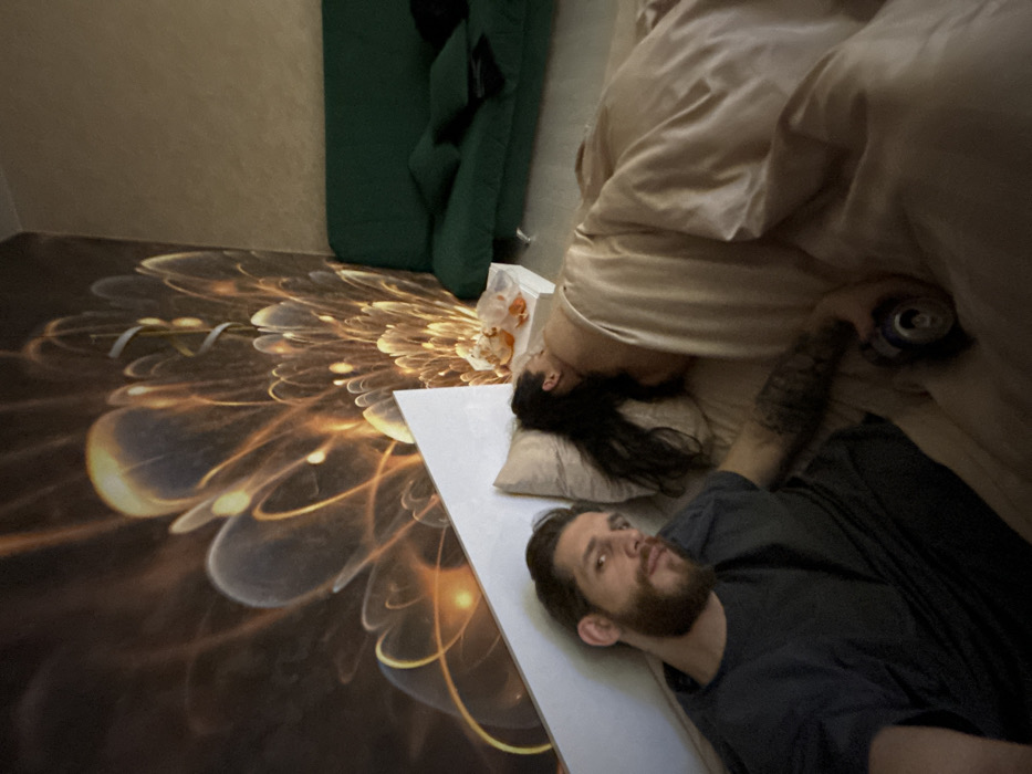 A man and a woman are lying next to each other on a bed. The woman is upside down, her head on a pillow at the edge of the bed. The man is lying normally, facing the camera. He has a beard and is wearing a dark shirt. He has tattoos on his arm. A can is visible in the background, near the woman. The floor has a design of glowing flowers. A green object is propped up against the wall in the background.
