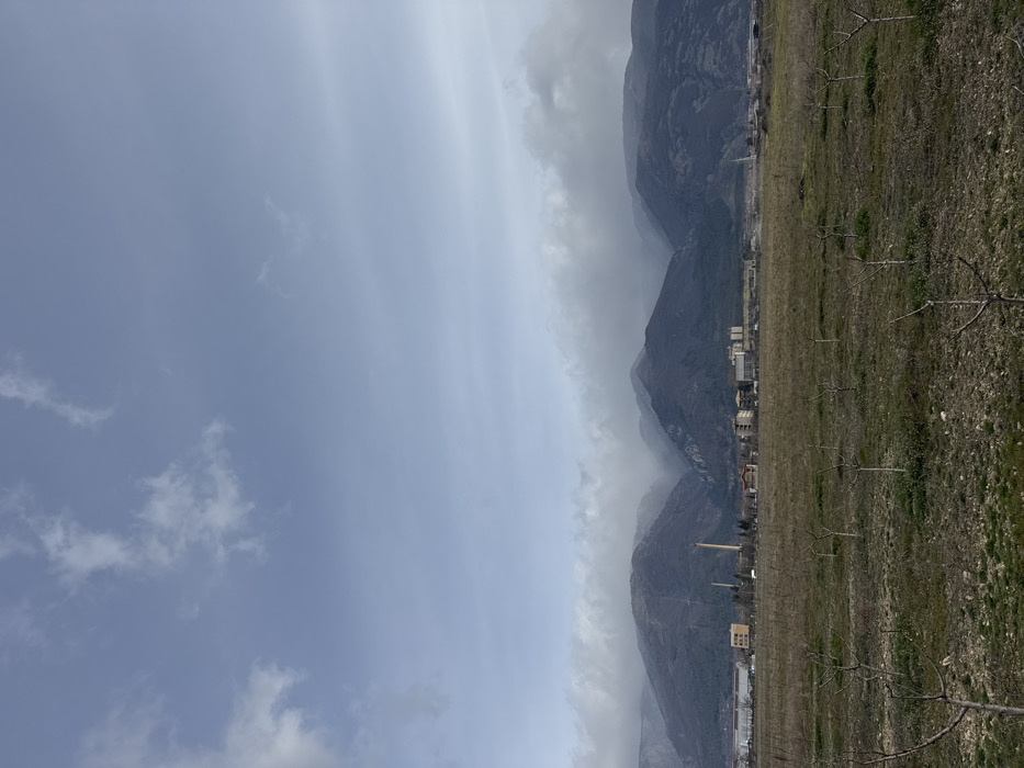 This image captures an expansive landscape view of Sopot, Bulgaria, under an overcast sky. The foreground consists of a wide, uncultivated field with dry, sparse green grass and visible patches of brown soil and scattered rocks. Numerous small, leafless deciduous saplings, appearing dormant, are sparsely distributed across this field, generally exhibiting bare branches. In the midground, a line of human-made structures is situated at the base of a mountain range. These structures include several low-rise buildings, some appearing residential with light-colored facades, others utilitarian or industrial. A prominent, tall, cylindrical chimney stack, light brown in color, rises from the left side of this developed area. The background is dominated by a rugged mountain range, characterized by dark, sparsely vegetated slopes. The upper portions and peaks of these mountains are largely obscured by a dense layer of low-hanging grey clouds or mist. The sky above the clouds is a pale blue-grey with faint, wispy white clouds at higher altitudes. The scene is devoid of human or animal figures, and no discernible actions or interactions are depicted. The lighting is diffuse, indicative of an overcast or partly cloudy day.