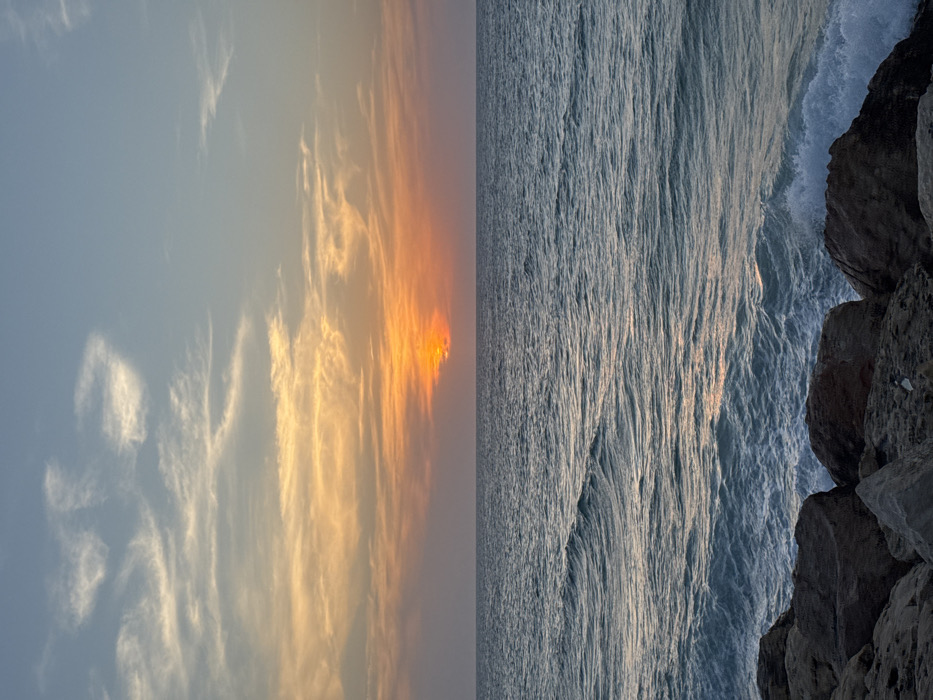 The image depicts a sunset over the Mediterranean Sea, observed from the coast of Tel Aviv, Israel. The horizon line bisects the frame horizontally. The upper half of the image features a sky transitioning from a light blue at the zenith to vibrant orange, yellow, and pink hues closer to the horizon, where the sun is partially visible as an intense orange disc. Wispy, white cirrus clouds are dispersed across the sky. The lower half of the image displays the sea, characterized by dark blue-grey water with visible wave patterns and ripples reflecting faint orange light from the sunset near the horizon. In the immediate foreground, a collection of large, dark grey to black rocks, consistent with a breakwater or rocky shore, occupies the bottom quarter of the frame. Waves are actively breaking against these rocks, producing white foam on the water's surface at the base of the rock formation. No individuals, vessels, or man-made structures are discernible beyond the rocks.