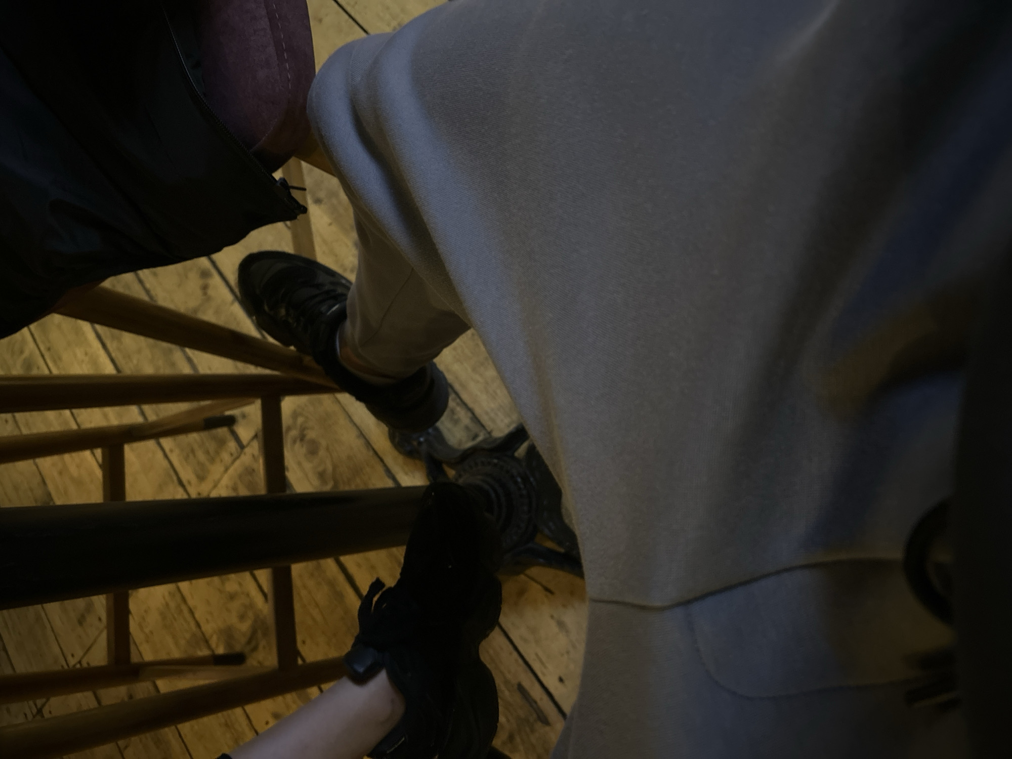 A person is standing on a wooden spiral staircase, likely indoors. The individual is wearing gray sweatpants and two different pairs of black shoes. The stairs appear to be made of light-colored wood, with black metal supports. The scene provides no clear indicators to confirm a specific location in Pernik, Bulgaria.