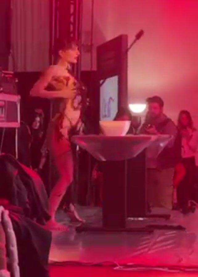 A performer in a dark, floral-patterned bodysuit stands barefoot on a lit stage. To the left, a sound system is visible, and a table covered in clear plastic stands center stage. A large white bowl rests on the table. Behind the table, a screen displays white text. The performer motions with her arms and adjusts her stance. Several spectators, some holding cameras, are visible in the background. The lighting is predominantly red, giving the scene a vibrant hue.