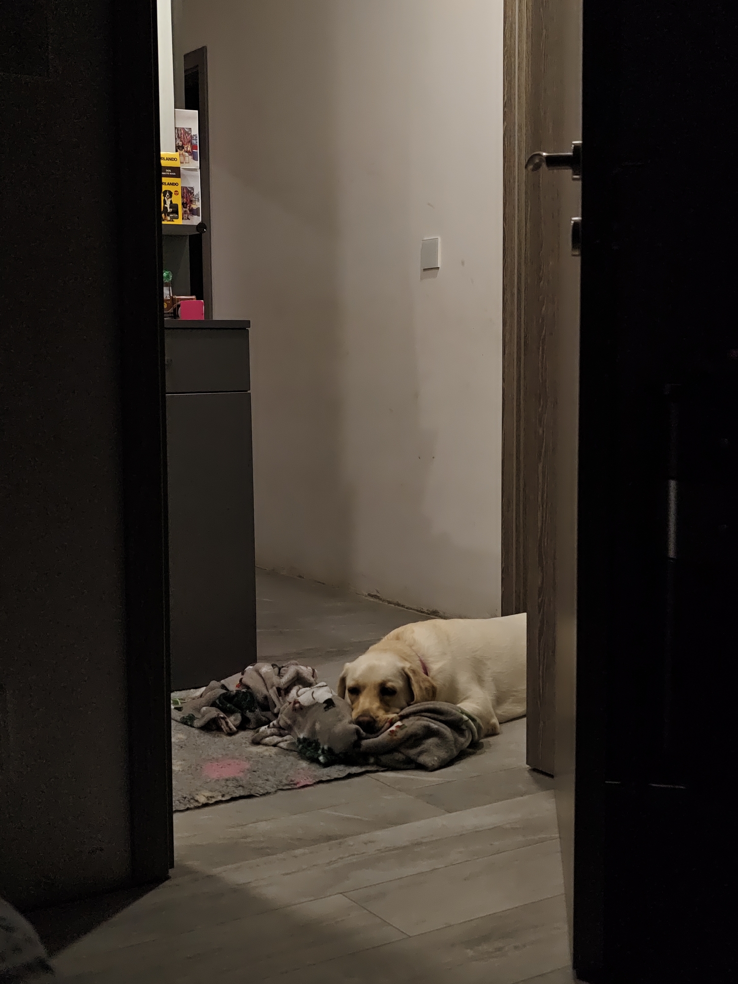 A cream-colored Labrador Retriever is lying on a gray rug in a room with a door partially ajar. The dog is resting its head on a gray blanket. The room has light gray walls and gray wood floors. A black cabinet with items on top is partially visible to the left. A light switch is on the wall. The location is Kozloduy, Bulgaria.