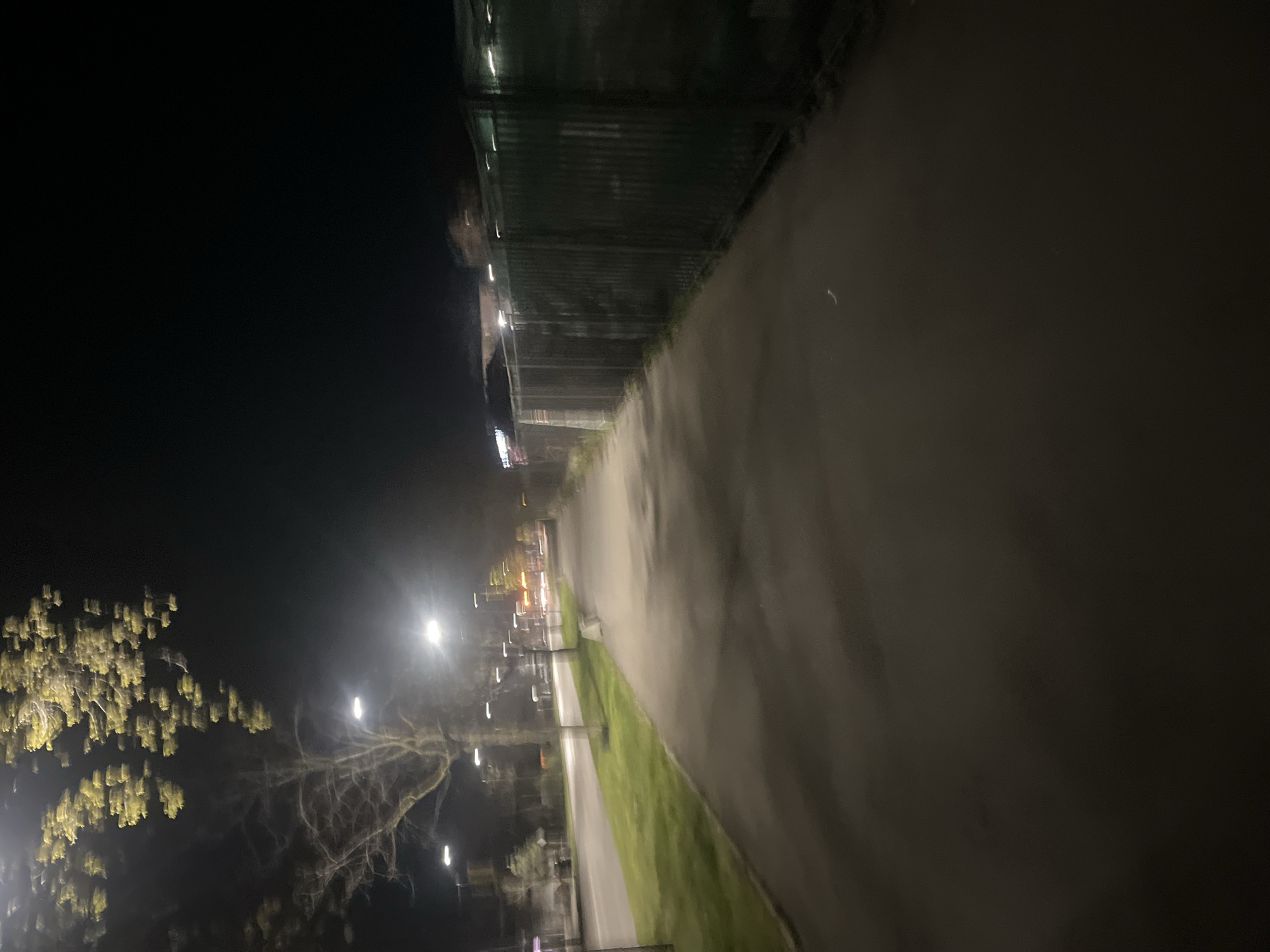 The image depicts a nighttime scene, likely a park or pedestrian walkway, in Montana, Bulgaria. A paved path extends into the distance, flanked by a grassy area on one side and a tall metal fence or barrier on the other. Streetlights illuminate the path, creating pools of light interspersed with shadow. In the lower left, a tree with sparse foliage is visible. The sky is dark, and the overall impression is one of urban isolation at night. There are no people visible in the frame.