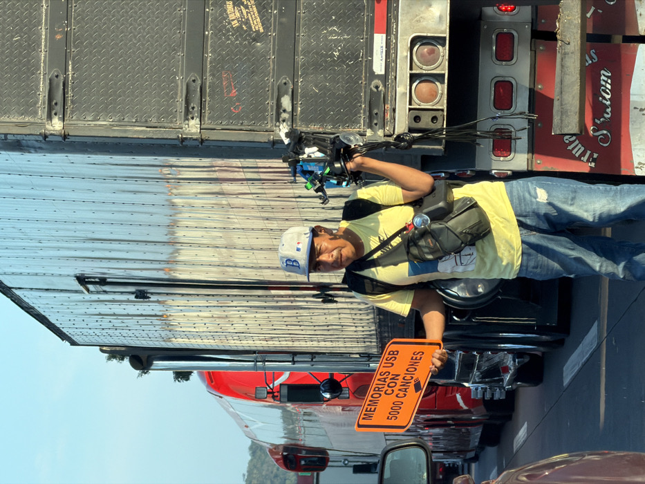 A man wearing a baseball cap, yellow t-shirt, and crossbody bag holds an orange sign written in Spanish "Memorias USB con 5000 canciones," meaning USB sticks with 5000 songs. He stands between lanes of traffic near a large truck. Other cars surround him, suggesting he's selling to drivers stuck in traffic. He is positioned in front of what appears to be an opened semi-truck trailer.