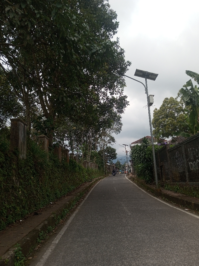 The image captures a paved road ascending slightly under an overcast sky in Zeyathiri District, Myanmar. On the left side, a verdant embankment covered with dense green foliage and moss supports a series of grey concrete pillars. Large trees with thick canopies obscure the upper left sky. On the right, a weathered concrete wall, marked with dark patches and graffiti-like scrawls, borders the road. A metal streetlight pole with a solar panel mounted at its top and a white rectangular box attached below is prominent on the right. In the distance, a single individual is observed operating a dark-colored motorcycle, moving away from the viewer on the road. Further along the right, parts of a white building with a reddish roof are visible amidst dense greenery. Distant hills and additional trees are present in the background.