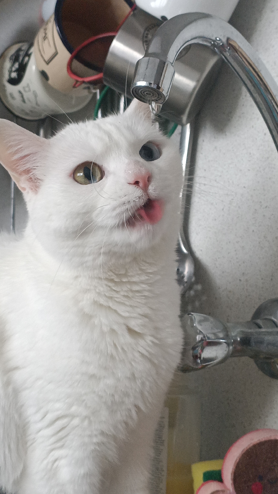 A white cat with heterochromia (one blue and one yellow eye) drinks water directly from a faucet. The cat’s tongue is extended, lapping at the water. The faucet is chrome, with a visible stream of water. There are mugs and cleaning supplies in the background. The location is unclear, but assumed to be somewhere in Slivnitsa, Bulgaria.