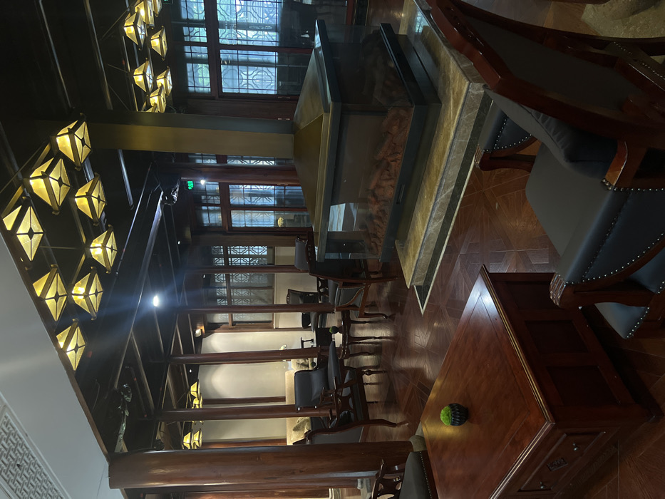 This image depicts an unoccupied interior lounge area, located in Tongxiang, China. The scene showcases a spacious room with dark wooden architectural elements, including numerous thick pillars and exposed ceiling beams. A central, square, four-sided glass electric fireplace with visible artificial embers is elevated on a multi-tiered light marble platform. A square, metallic chimney structure extends vertically from the fireplace to the ceiling. Seating arrangements are distributed throughout the room, consisting primarily of dark wood armchairs with dark grey upholstered cushions and backs, often featuring decorative metallic studding. These chairs are positioned around dark wood coffee tables, some rectangular with drawers, and others round. In the background, lighter-colored upholstered sofa seating is visible against a wall. The ceiling is equipped with multiple square-pyramidal light fixtures with yellowish glass panels, interspersed with recessed spotlights, providing illumination. Large, wooden-framed windows with intricate lattice designs are visible along the far walls, admitting ambient light. The floor is composed of dark wood parquet laid in a geometric pattern. A small green potted plant is centrally placed on a rectangular coffee table in the foreground. No individuals, actions, or interactions are present in the scene.