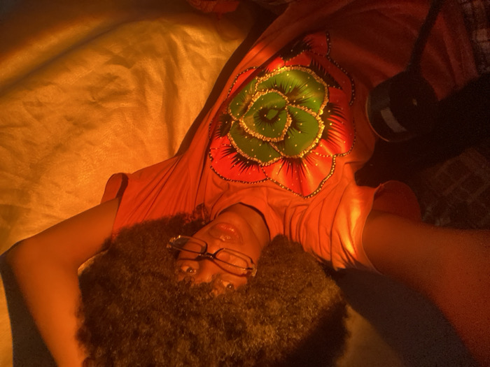 A person with large, dark, curly hair wearing glasses lies on their back, their head angled towards the viewer. They wear a reddish-orange t-shirt featuring a stylized green and red flower with gold trim on the chest. The scene is illuminated with a warm, golden light, giving the image a soft, intimate feel. Some dark object appears beside the figure.