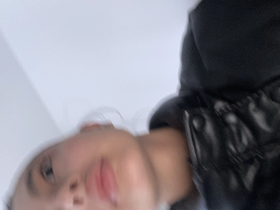 A blurry, close-up shot shows a person from a low angle. Part of their face, including a nose, lips, and one eye, is visible. To the right, there's a shiny, black, quilted jacket with a button. The background appears to be a light, neutral color. The image is out of focus.