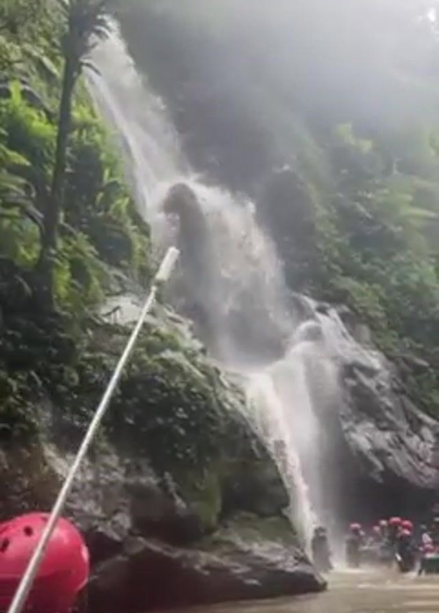 cascading waterfall in a lush, green environment. The water is clear and flows over dark rocks covered in moss and vegetation. A group of people wearing helmets and life jackets is wading through the water at the base of the waterfall. One person is visible in the foreground, wearing a red helmet and holding a red paddle. The overall scene appears to be a recreational water activity.