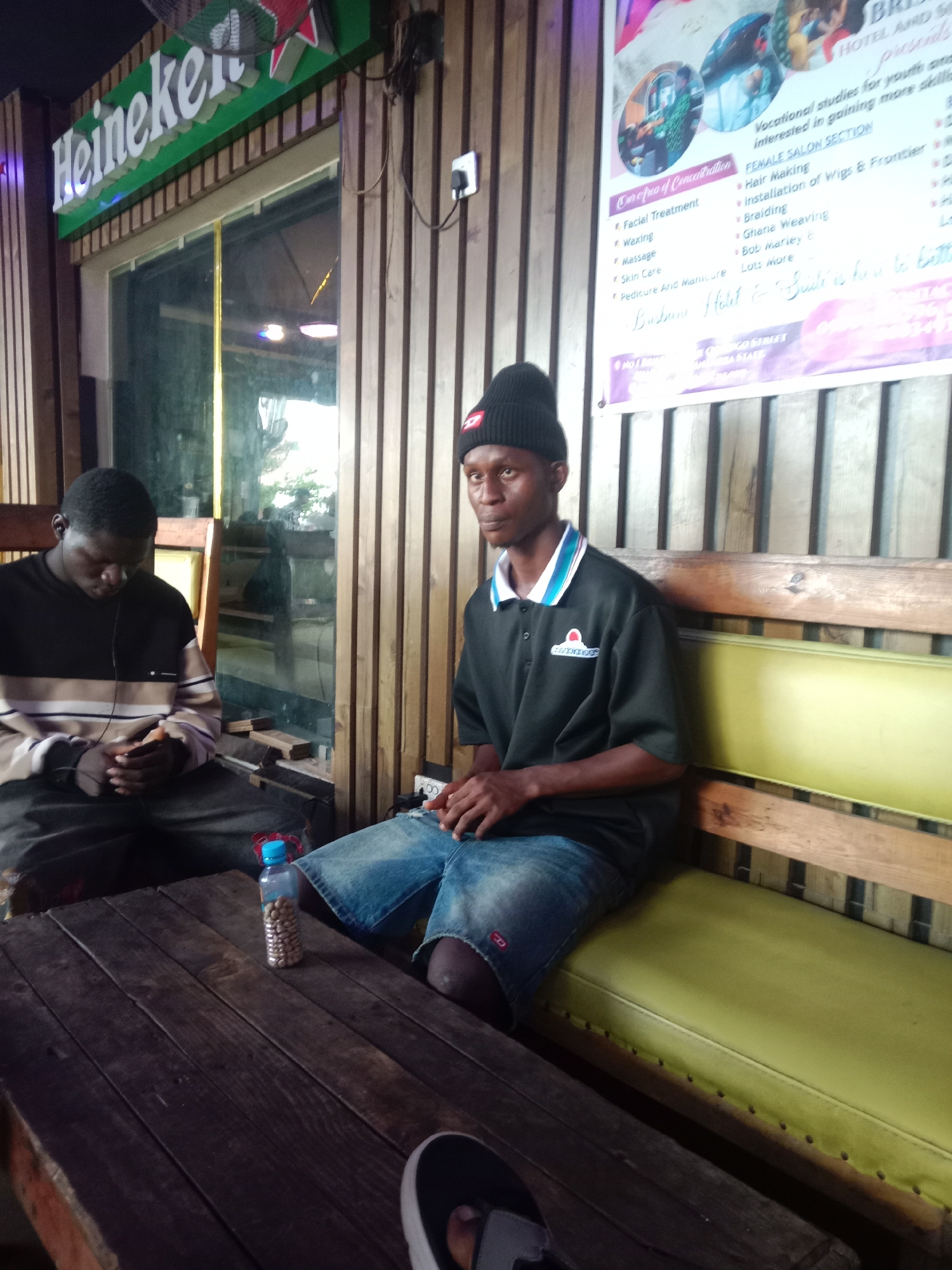 Two young men are sitting at a weathered wooden table in an outdoor setting. The man on the left is looking down at his phone, while the man on the right is looking at the camera. On the table between them is a plastic bottle filled with peanuts. In the background, there is a Heineken sign and a poster for "Barbara Hotel & Suites," located on Iweka Road, in Onitsha, Nigeria. The poster lists vocational studies and a "Female Salon Section" with offerings like hair making and braiding. The backdrop features vertical wooden slats.
