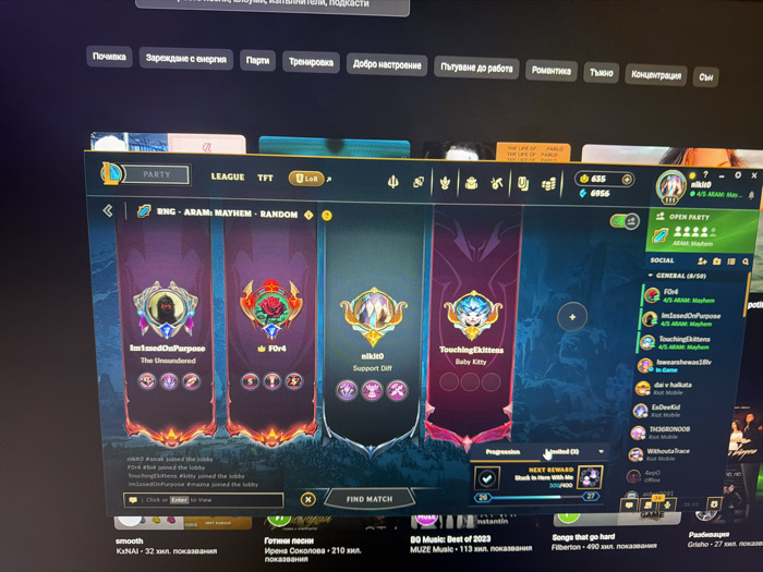 The image displays a close-up, angled view of a computer monitor, situated in Burgas, Bulgaria. The screen predominantly shows the user interface of the League of Legends video game client, specifically a pre-game lobby. Four player profiles are visible, with banners indicating their status: "Im1ssedOnPurpose" (The Unsundered), "F0r4," "niki10" (Support Diff), and "TouchingEkittens" (Baby Kitty). The game mode selected is "RNG - ARAM: MAYHEM - RANDOM." A chat log at the bottom left indicates players joining the lobby. To the right, a social panel lists online contacts and their in-game status. Above the game client, a separate application, likely a web browser or music player, displays several tabs with Cyrillic text, suggesting categories like "Почивка" (Rest), "Зареждане с енергия" (Charging with energy), "Парти" (Party), and "Тренировка" (Training). At the very bottom of the screen, elements of a music player are visible, showing track information such as "smooth" and "BG Music: Best of 2023." The overall scene depicts a digital entertainment setup centered around online gaming and music.
