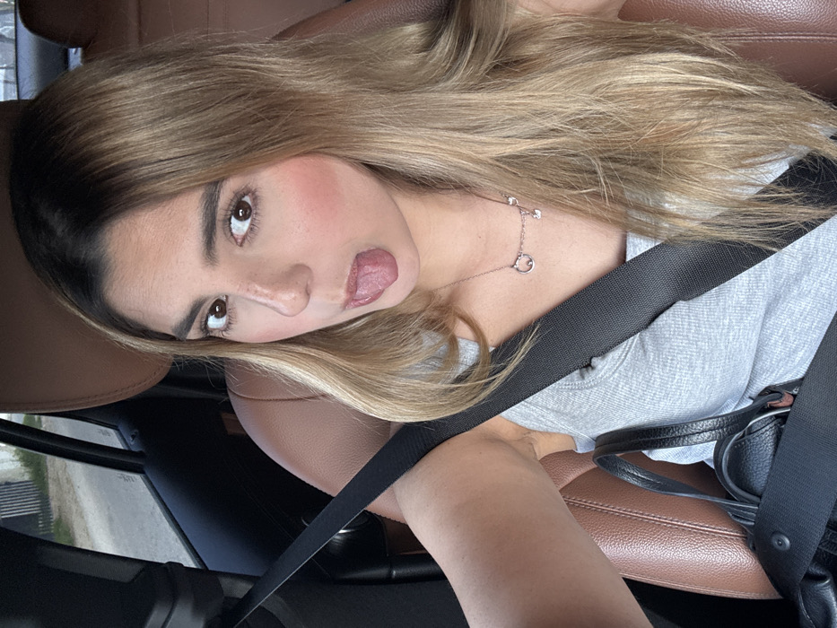 A woman is depicted seated in the passenger seat of a vehicle in Mérida, Mexico. She has long, light brown hair with darker roots, brown eyes, and visible freckles on her nose. Her tongue is extended from her open mouth. She is wearing a light grey, ribbed tank top and a silver-toned necklace with multiple small pendants. A black seatbelt is worn across her chest and shoulder. A black handbag is partially visible to her lower left, secured by the seatbelt. The vehicle's interior features brown leather upholstery on the seats. Through the window on the woman's left, an unpaved road and a light-colored building or wall are discernible in the background.