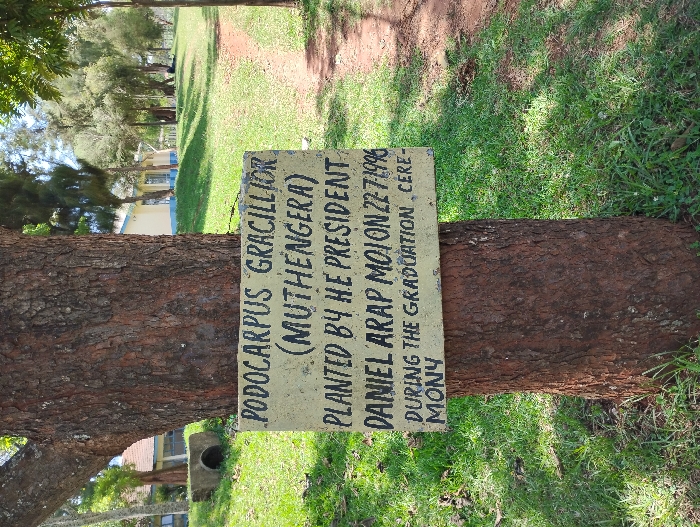The image displays an outdoor scene in Karai ward, Kenya, centered on a mature tree. The tree features thick, textured, reddish-brown bark. A rectangular, faded yellow sign is affixed to the tree trunk, bearing black, hand-painted capital letters. The text reads: "PODOCARPUS GRACILLIOR (MUTHENGERA) PLANTED BY H.E PRESIDENT DANIEL ARAP MOION 22.7.1996 DURING THE GRADUATION CEREMONY". The ground around the tree is covered in green grass. To the left of the tree, a grey concrete culvert section rests on the grass. A reddish-brown dirt path extends from the mid-ground into the background on the right. In the background, a building with light blue lower walls, a lighter upper section, and a reddish-brown tiled roof is partially visible on the left. A line of tall, slender trees with green foliage stands further back, bordering the path. The scene is illuminated by daylight. No individuals or active interactions are depicted.